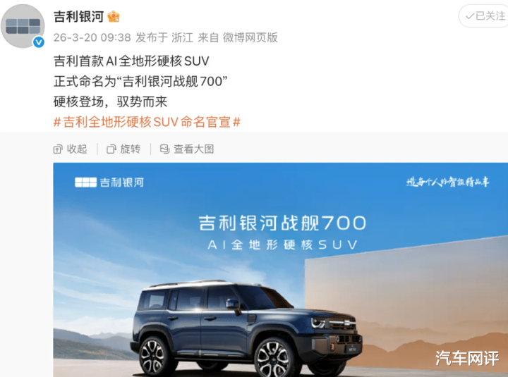 3月20日,吉利银河正式官宣旗下首款AI全地形硬核SUV定名为银河战舰700,这款被网友称作“杭州湾卫士”的硬派方盒子车型,一经定名便引爆全网热议,不少网友直言:只要定价合理,必成爆款。