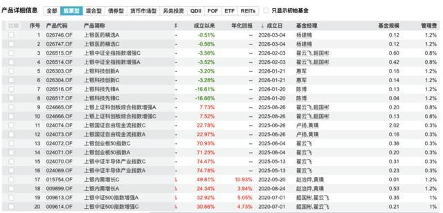 值得关注的是,上银基金2026年以来成立的4只股票型产品,目前回报率均为负。其中上银中证全指指数增强A、C规模分别为0.42亿、0.6亿元,成立以来回报率-3.52%、-3.56%,跑输同期沪深300指数回报率0.66%,同类排名912/965、913/965。